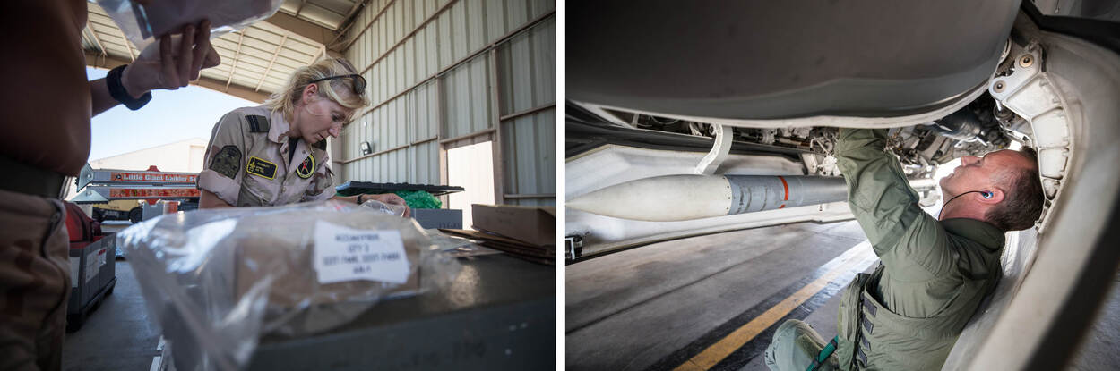 Links: Spin in het logistieke web van 323 Test and Evaluation Squadron is toegevoegd operationeel maintenance kapitein Myrna. | Rechts: Pre-flighten: het vliegtuig nog eenmaal nakijken voor het wegvliegen.