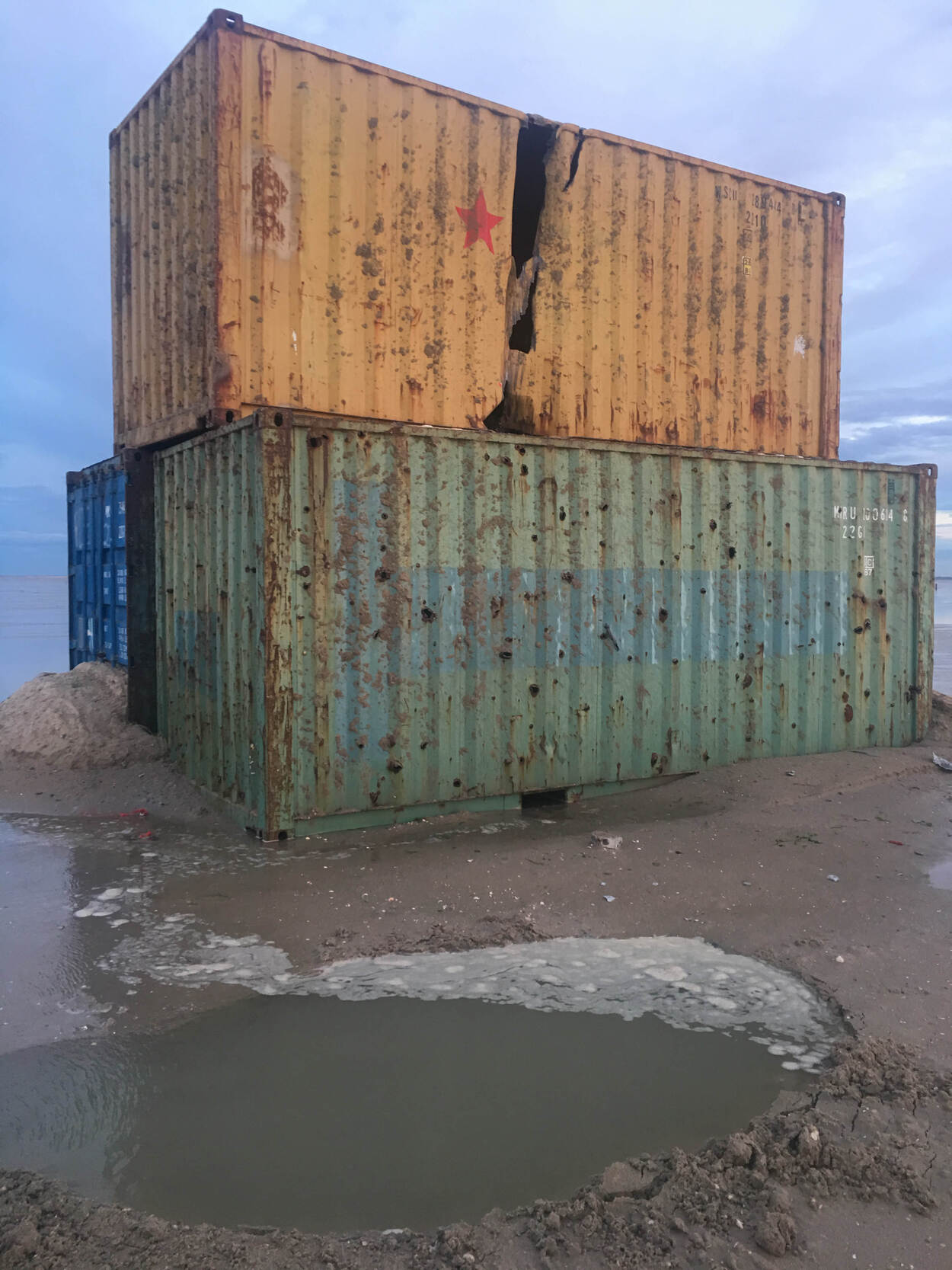 De containers zijn opengesleten na inslag van de oefenbommen.