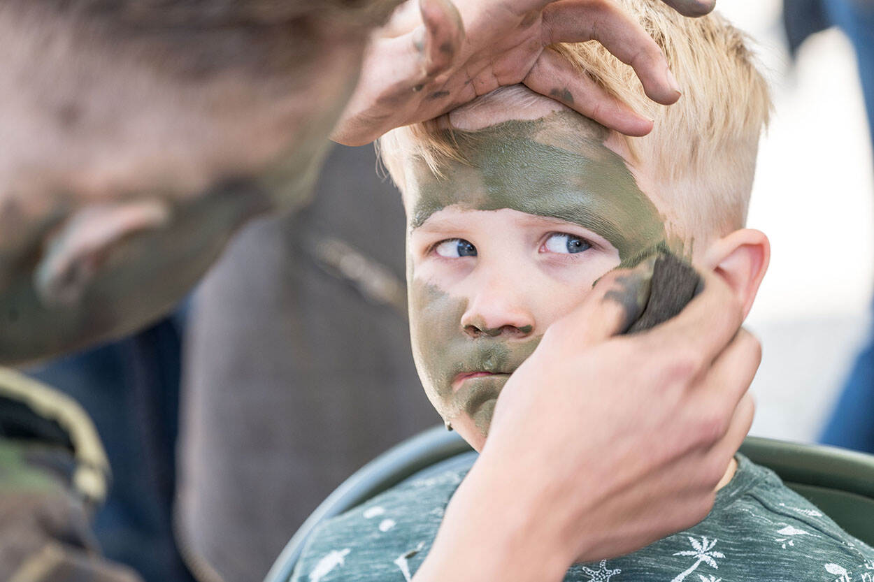 Een goede camo is het halve werk, leert deze jonge bezoeker van de Jumbo Racedagen. Defensie was op het circuit aanwezig met een F-16, die vlak voor de tunnel stond. Daar konden geïnteresseerden informatie krijgen over banen bij de krijgsmacht, die altijd op zoek is naar technisch geschoold personeel. Foto: John van Helvert.