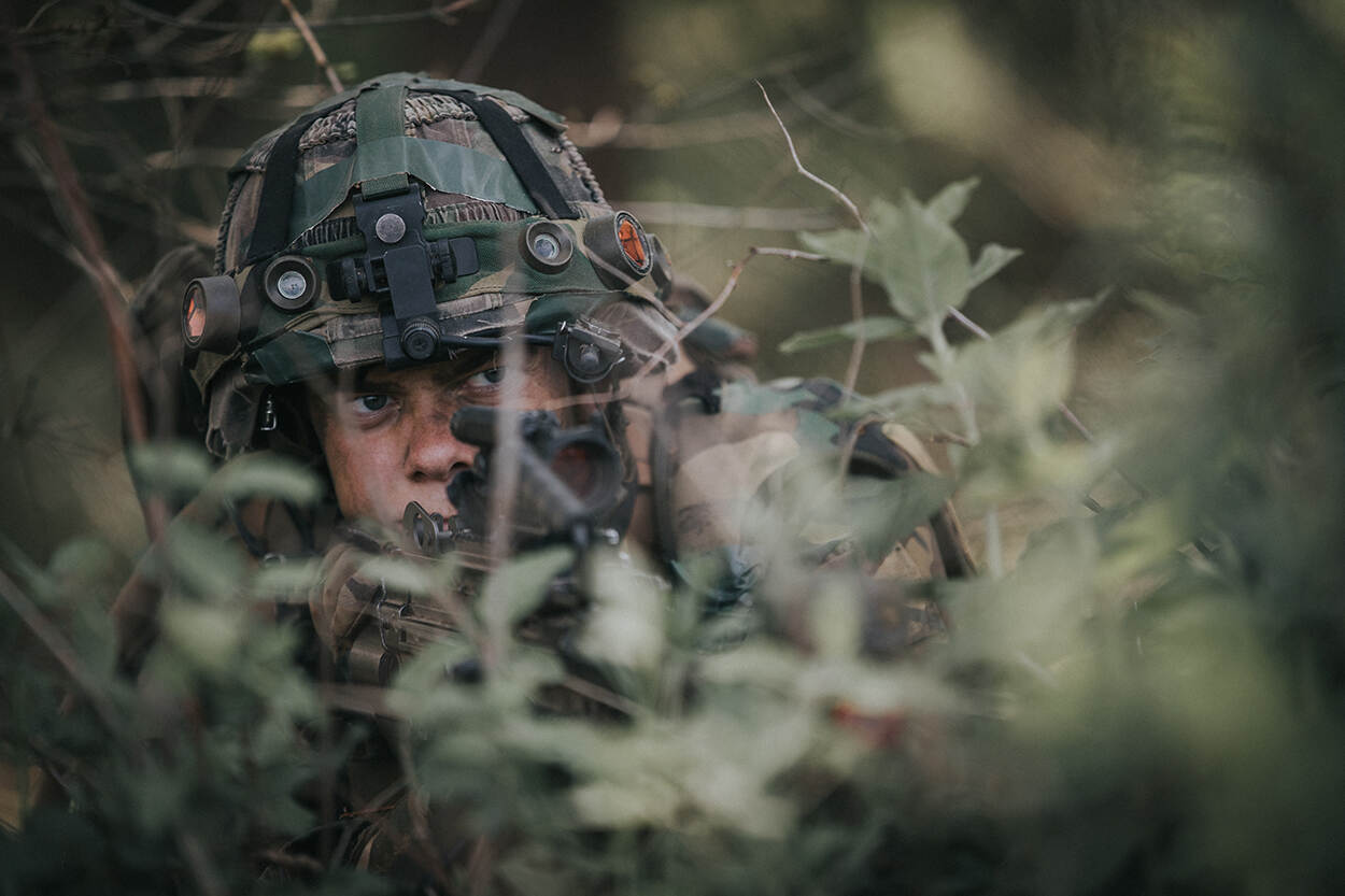 Opperste concentratie bij deze militair van 11 Luchtmobiele Brigade tijdens de oefening Green Griffin. Tijdens de oefening met Duitse collega’s van de Division Schnelle Kräfte worden air assaults getraind. Foto: sergeant Jan Dijkstra.