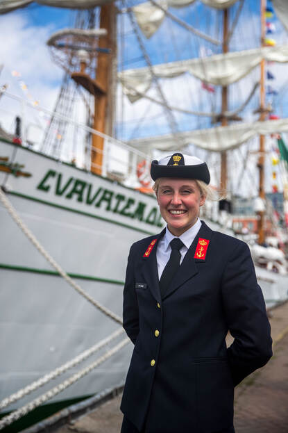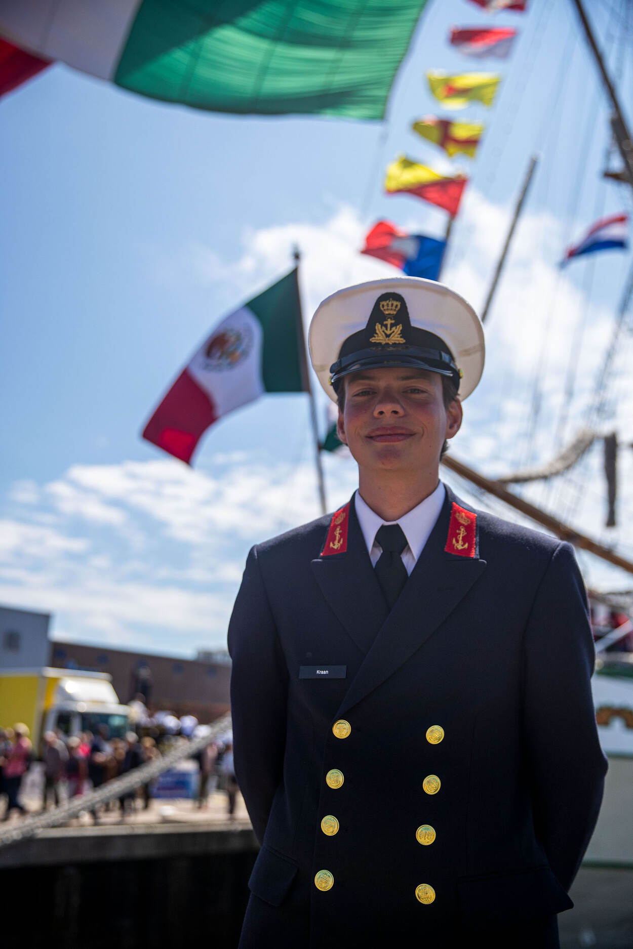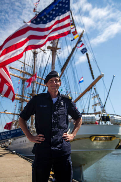 De rol van de Nederlanders aan boord eindigt niet wanneer de schepen in Scheveningen aanmeren. De adelborsten die zijn verspreid over een deel van de marinevloot treden gedurende Sail op als liaison tussen de bemanning en de havenautoriteiten. Is het drinkwater zuur of heeft men niet het juiste koppelstuk voor een leiding naar de wal, dan komen de jonge cadetten in actie. “We zijn ook meegevaren om wat vertrouwder met de bemanning te raken”, aldus adelborst Jesse Groot. En is zo’n tripje als dit voor herhaling vatbaar? “O ja zeker wel. Ben je eenmaal gewend aan de geringe privacy en ritueeltjes als de verplichte klim in de mast voor het ontbijt dan heb je hier een toptijd.”