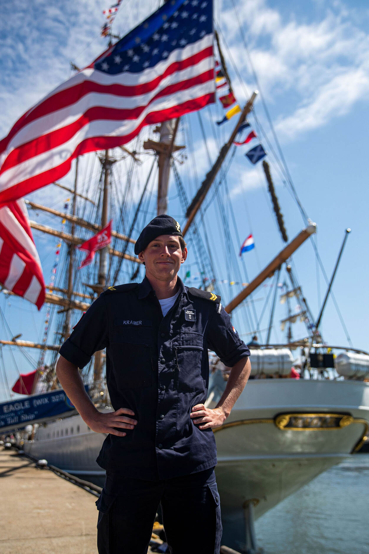 Wie ook mooie ervaringen opdeed, is korporaal-adelborst Olaf Kramer. Hem viel de eer te beurt aan boord van het Amerikaanse zeilschip Eagle van de U.S. Coast Guard te embarkeren. Hier heerst absolute orde. Of zoals Kramer het zegt: “het is allemaal een stukkie strakker dan bij ons.” Iedereen houdt zich bij havenbezoeken aan de avondklok en ook de scheiding tussen officieren en manschappen is menens. “Daarbij moet de commandant van alles iets vinden.” Je zou zeggen dat een jongen uit een liberaler militaire omgeving het moeilijker heeft in een wereld waarin de puntjes rotsvast op de i staan. Niets is minder waar. “Ik kom uit een ‘marinenest’ waarin aanpassen de gewoonste zaak van de wereld is. En uiteindelijk werken veel marines hetzelfde. Vaak is het een kwestie van orders accepteren en opvolgen.”