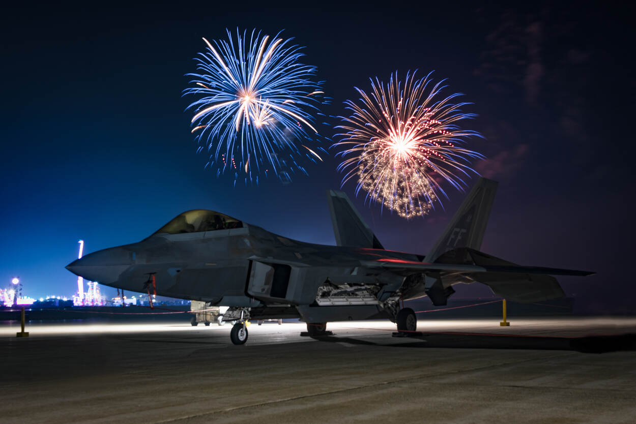 De F-22 Raptor, het grotere broertje van de F-35 staat tegen een achtergrond van fraai siervuurwerk op ‘the 4th of July’. De foto werd gemaakt door tweede-luitenant Samual Eckholm op de vliegbasis Battle Creek in de staat Michigan.