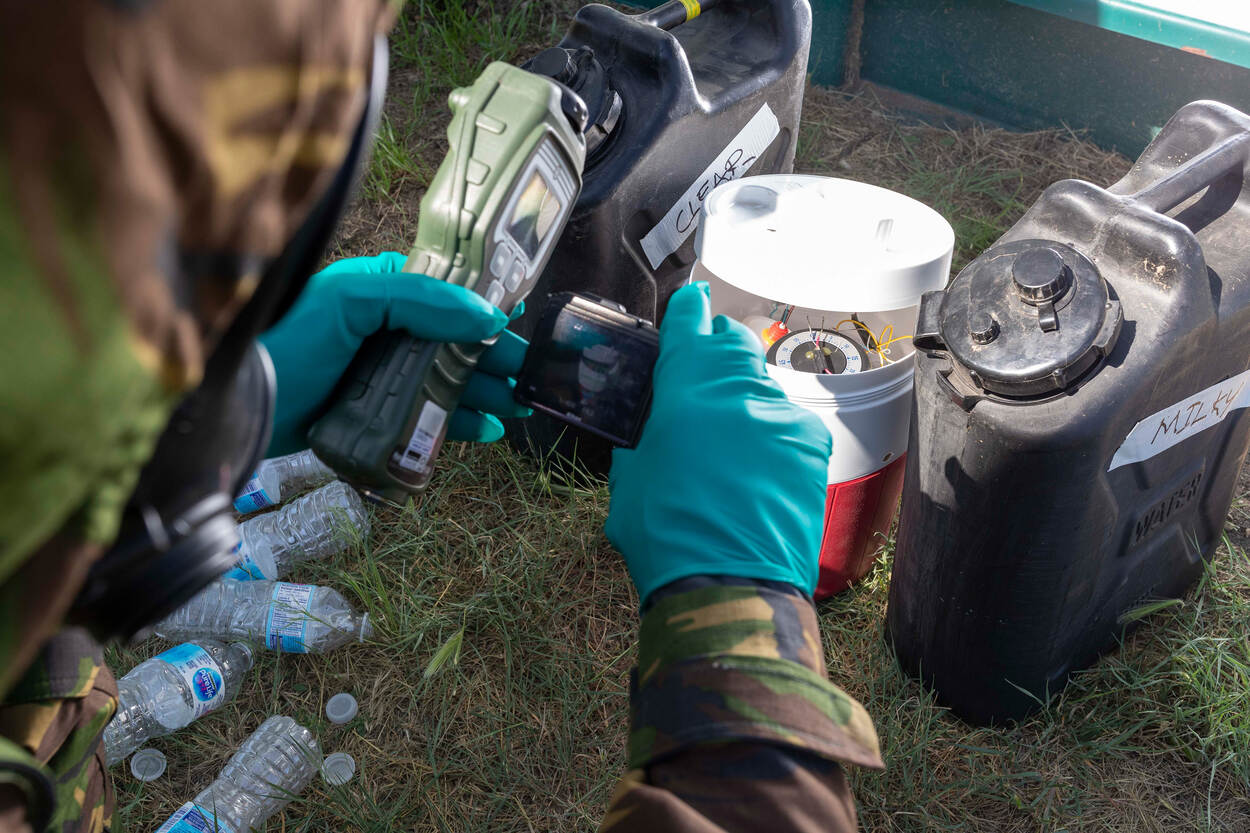In Canada wordt geoefend met verschillende scenario’s. Zo troffen de CBRN-specialisten onder meer een zelf gefabriceerd sproeivliegtuig aan. Verstopt tussen de bakken met een chemisch middel, vonden de CBRN-verkenners een bom. Tijd om de EODD op te roepen.