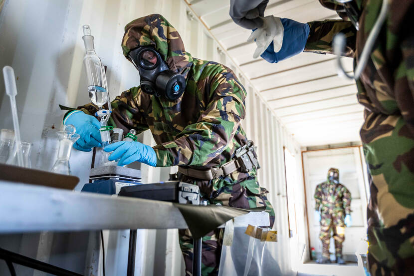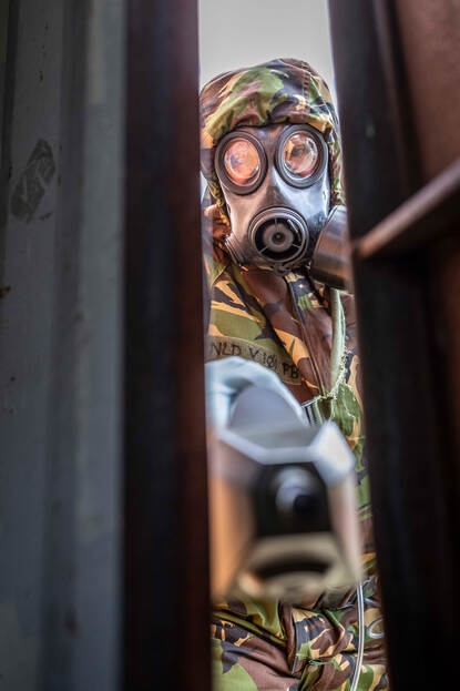 Gekleurde vrachtcontainers liggen verspreid over het terrein. Er tussendoor lopen militairen volledig gehuld in niets-doorlatende pakken. CBRN-maskers op de gezichten, handschoenen aan. Een beeld dat doet denken aan een scene uit een post-apocalyptische film. In de containers spelen zich verschillende scenario’s af. Zo stuitte Kelvin eerder op een ‘chemisch lab’, achtergelaten door een terrorist. De taak van de CBRN-verkenner en zijn 3 collega’s: achterhaal welk middel er mogelijk in de installatie van reageerbuizen en kolven wordt gemaakt, neem de juiste samples en breng deze veilig naar het lab. In dit geval blijkt het te gaan om chloorgas, een verstikkend middel dat gebruikt wordt tijdens aanslagen.