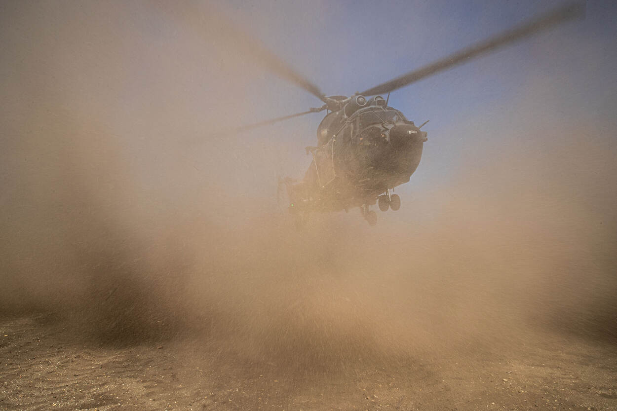Tijdens de landing kan de heli ongemerkt draaien of kantelen. “Dat kan zo weinig zijn dat je in de helikopter niks voelt”, legt vlieger kapitein Rick uit. “Als je dit te lang niet doorhebt, kom je in de problemen. De heli verandert van plek of landt bijvoorbeeld op zijn staart.” Met een zandlanding raak je het zicht hoe dan ook een keer kwijt. “Onvermijdelijk, maar je wilt dat moment zo lang mogelijk uitstellen. Pas als de heli dichtbij de grond is en het moet zo snel mogelijk voorbij zijn.”