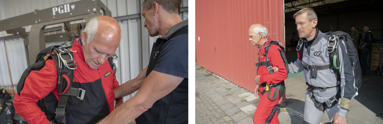 Afgelopen week melden Wiebren en Erik zich in Midden-Brabant op vliegveld Seppe. Para-instructeur sergeant-majoor Johan ontfermt zich over Wiebren. Dat hij blind is, levert voor de sprong geen enkele beperking op. En Erik? Voor hem heeft voorlichter kapitein Bart de Graaff een verrassing in petto: ook hij mag springen. “Dit is iets wat we bij hoge uitzondering doen”, schetst Bart wat achtergrond. “Een tandemsprong is voor ons een operationeel instrument om een tolk, dokter of andere specialist snel op een moeilijk bereikbare plek te krijgen. Het beoefenen daarvan, gebeurt vrijwel altijd intern, met eigen personeel.”