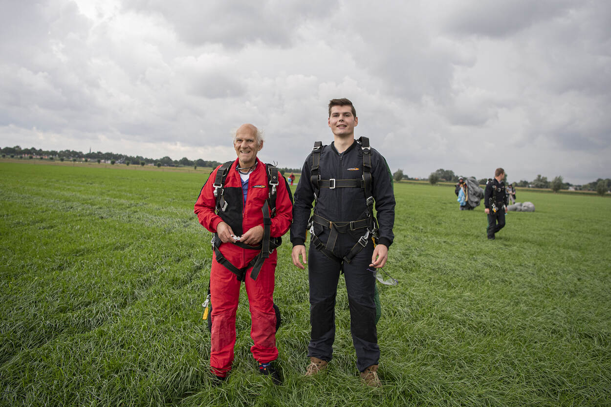 Even spant het erom of het luchtavontuur wel doorgaat. Op het moment dat het vliegtuig de wielen los heeft, komt er vanuit het zuidwesten rap een dreigend luchtje aan. Een depressie kan roet in het eten gooien. Gelukkig heeft de vlieger weinig tijd nodig om bij het drop point te komen. Wiebren en Erik mogen er op 12.500 voet uit. Op die hoogte hebben ze 45 seconden de tijd om dat machtige gevoel van totale vrijheid te ervaren. Eenmaal geland op een weilandje dichtbij Seppe tovert Erik een brede lach op de kaken. Hij glanst van geluk. “Fantastisch”, roept hij uit. “Dat uitzicht, die snelheid, dat bochtjes draaien net voor de landing. Voor mij was het allemaal nieuw.” Vader Wiebren is wat behoudender in zijn commentaar. Maar met een: ‘Geweldig, het was een mooie ervaring’ geeft ook hij aan de tijd van zijn leven te hebben gehad. Sterker, hij zou het zo weer doen.