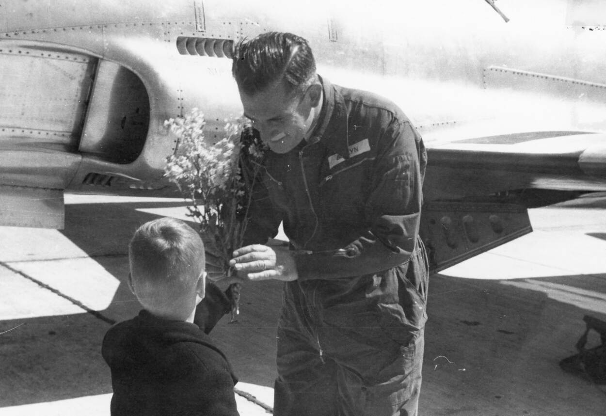 De commandant van de 1e Tactische Vliegbasis (Volkel), Dick Berlijn (vader van de latere Commandant der Strijdkrachten), ontvangt een boeket tijdens de opening van de startbaan vliegbasis De Peel op 1 mei 1957.