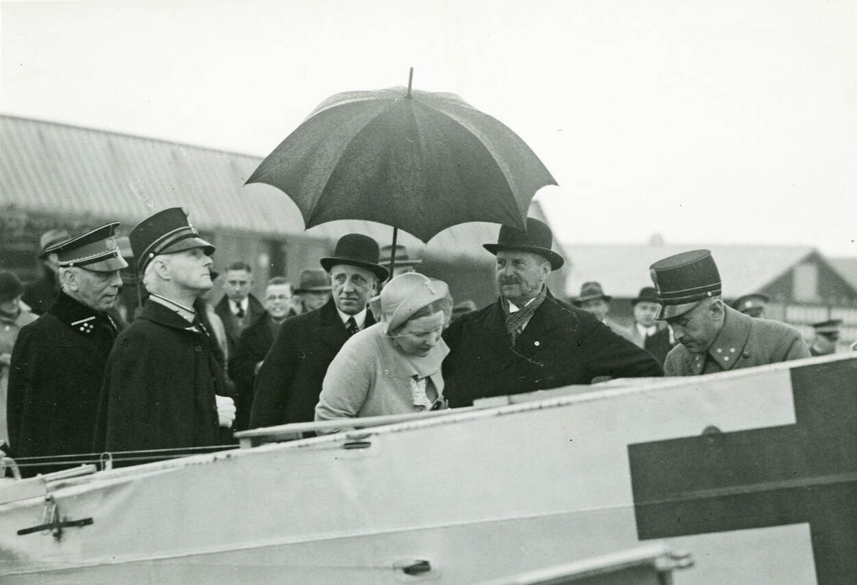 Bezoek van Prinses Juliana aan Soesterberg op 18 mei 1935. Hier bekijkt zij het ambulancevliegtuig, een Fokker S.IIa. Links kolonel P.W. Best, commandant van de Luchtvaartafdeling.