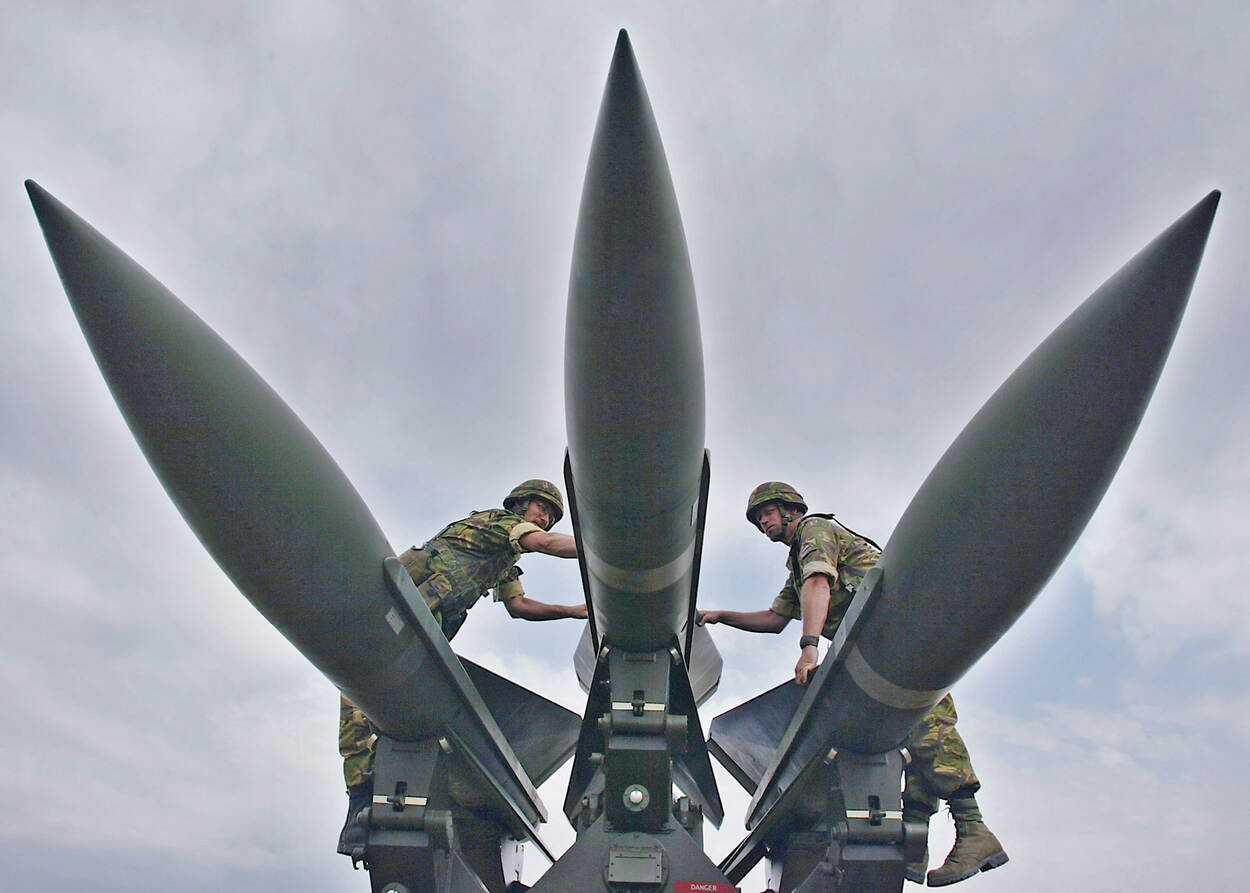 Personeel loopt in 2002 op de Peel raketten na van een Raytheon MIM-23 HAWK lanceerinrichting van de Groep Geleide Wapens (GGW).