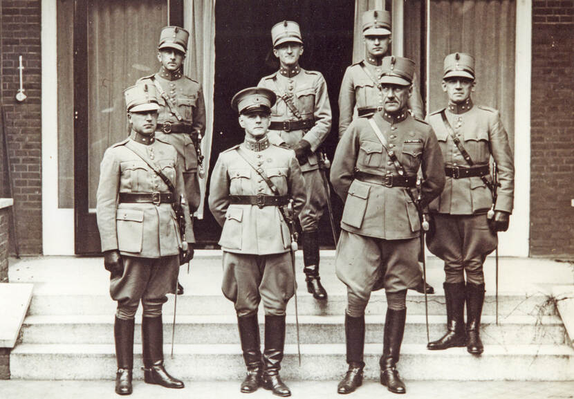 De nieuwe commandant van het Commando Luchtverdediging, generaal-majoor P.W. Best, omringd door zijn staf. Links van Best staat majoor J.H. Droste, rechts luitenant-kolonel V.E. Wilmar. Achter het drietal bevinden zich van links naar rechts: kapitein B.J.M. Koenen, kapitein P.J. de Broekert, 1e luitenant S.H. Hoogterp en kapitein A. den Hertog.
