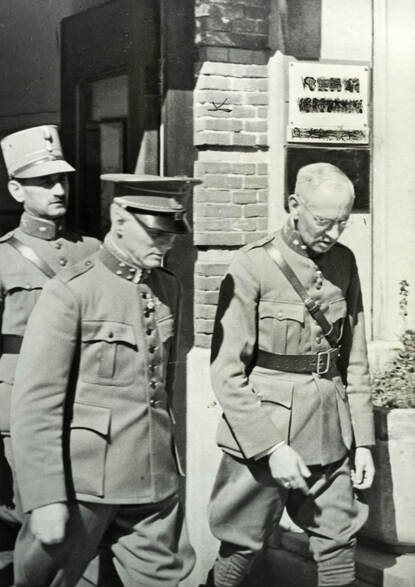 Generaal-majoor P.W. Best verlaat in gezelschap van een 1e en 2e luitenant het hoofdkwartier van de Luchtverdedigingskring Amsterdam.