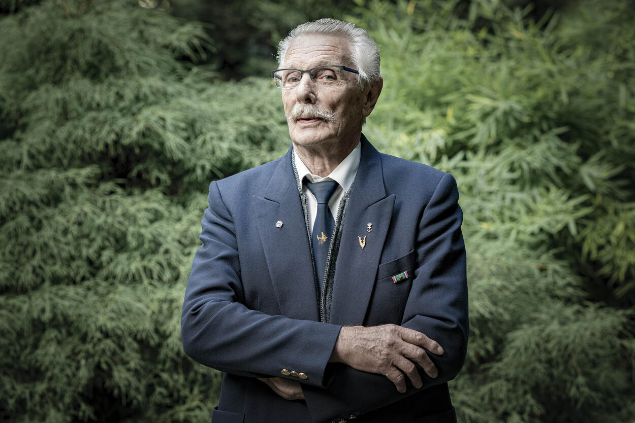 Alleen het veteranenspeldje op de jas van Pieter van der Linden verraadt dat deze oud-seiner op Hr. Ms. Friesland in dienst is geweest. “Persoonlijk vind ik een baret en al die medailles flauwekul. Ik had een mooie periode bij de marine, maar die tijd ligt achter me. 2 keer ben ik in Nieuw-Guinea geweest, in 62 en 63. We hebben daar een aantal gevechten met de Indonesische marine gehad, bij de eilanden Gag en Misool. Met m’n 50e ging ik eruit, mijn zoon heeft voor een zelfde carrière gekozen maar die moet wat langer”, lacht Van der Linden. “Mijn vriendin en ik hebben er een weekendje Rotterdam van gemaakt. Militaire muziek vind ik prachtig, ook de ceremonie eromheen. En doedelzakken, maar dat moet ook weer niet te lang duren. Tijdens de vierdaagse liep ik achter ze aan. Wat een herrie!”