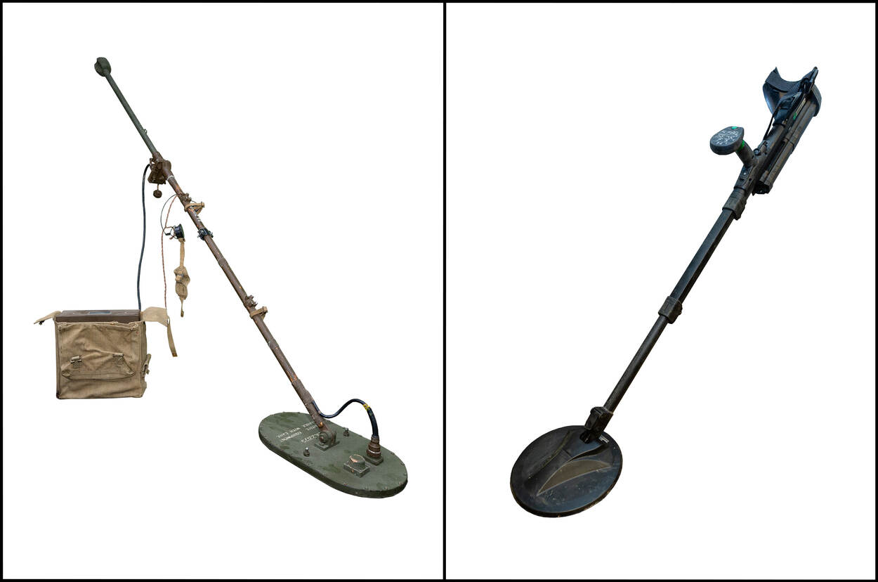 De mijndetector spoort metaal in de grond op en werd tijdens en na de Tweede Wereldoorlog gebruikt voor het zoeken naar mijnen. Tegenwoordig is het apparaat 1 van de belangrijkste hulpmiddelen voor de EOD in missiegebieden, zoals Afghanistan. Zonder mijndetector zetten EOD’ers geen stap in IED-verdacht-gebied. Het apparaat ondervond door de jaren heen een aantal verbeterslagen en is nu een stuk lichter, handzamer en beter in balans dan de variant uit de oorlog.