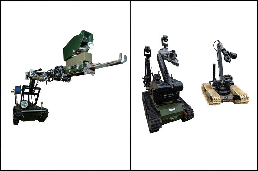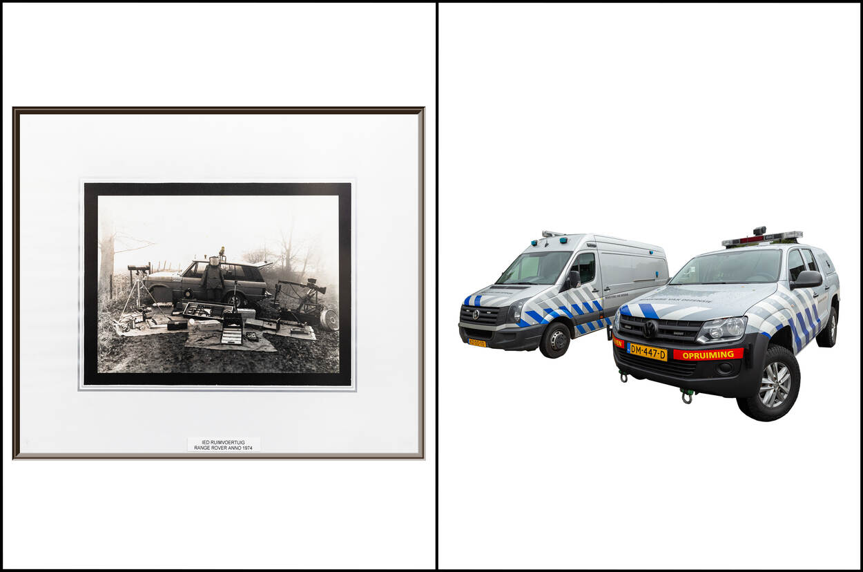 Als antwoord op de verhoogde dreiging door IED’s werd in Engeland een robot ontwikkeld. Zo hoefde de EOD’er niet meer zelf een pakketje te inspecteren. Het allereerste exemplaar was een kruiwagen met een motortje. De robot op de foto was de eerste versie die Nederland kocht. Een wereld van verschil met de robots die de EOD tegenwoordig gebruikt. Voor verkenningen, maar ook om de bom op afstand onschadelijk te maken. Niet alleen de camera’s en techniek zijn flink verbeterd, ook de aantallen. Was er in de jaren 70 slechts 1 EOD-robot, tegenwoordig zijn 8 EOD-voertuigen uitgerust met 2 robots in verschillende formaten. Naar gelang de opdracht wordt bepaald welke robot naar voren gaat. De grootste kan objecten verplaatsen, de kleinste rijdt met gemak onder stoelen in een bus door.