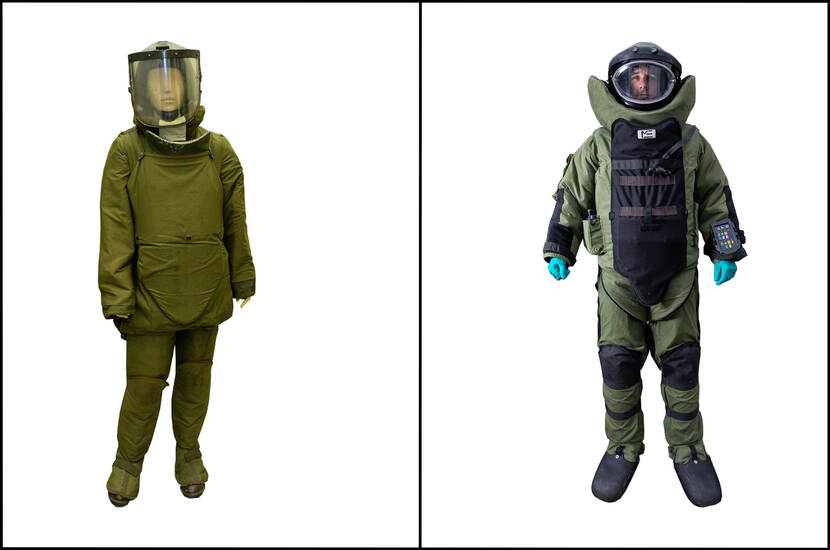 In de jaren 70 maakte Europa kennis met een nieuwe dreiging: Improvised Explosive Devices (IED’s). Terreurorganisaties zoals de IRA knutselden zelf explosieven in elkaar. Deze IED’s zijn een stuk onvoorspelbaarder dan de conventionele explosieven uit de Tweede Wereldoorlog, omdat niet bekend is hoe ze werken. Een bompak werd ontwikkeld om de EOD’er te beschermen als het mis zou gaan. De eerste modellen waren groot en lomp met weinig bewegingsvrijheid. Tegenwoordig is dat anders. Hoewel het pak nu zwaarder is dankzij materiaal dat beter beschermt, kan de EOD’er zich goed in bewegen. Het pak van nu heeft verder luchttoevoer en lichtopties, te besturen door de EOD’er zelf met hulp van een bedieningspaneel op zijn arm. Deze nieuwste versie heeft ook een microfoon op de helm, de EOD’er kan zo in het pak horen wat zich buiten afspeelt. Nuttig in het geval van bommen met een uurwerk dat tikt.