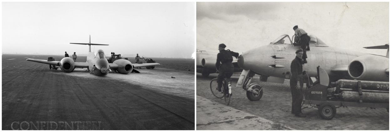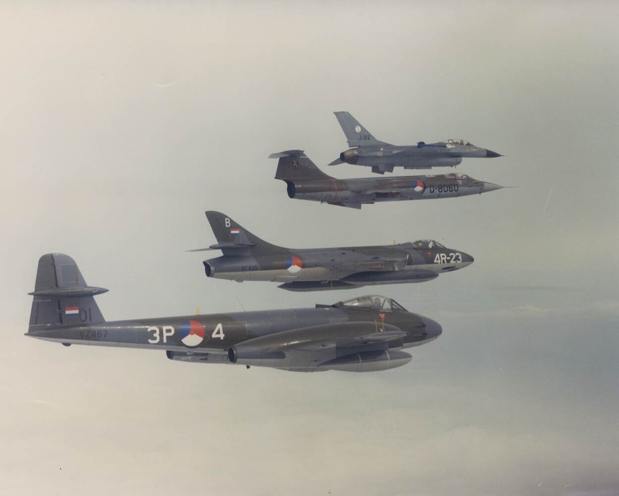 We beginnen een paar jaar na de Tweede Wereldoorlog. De Koude Oorlog is begonnen en Nederland moet zich als lid van de NAVO herbewapenen. De 2-motorige Britse Gloster Meteor arriveert in 1949, het eerste straalvliegtuig dat op Leeuwarden wordt gestationeerd. Een echt 1e generatie overgangsvliegtuig; de propeller is ingeruild voor straalmotoren. Eigenlijk is er niet meer veranderd: geen radar, geen schietstoel (althans niet in de eerste versie), maar toch is iedereen euforisch over de 'glanzend witte vogels' die met ruim 900 km/u het luchtruim doorklieven. We krijgen in totaal 266 Meteors in diverse uitvoeringen, waarvan er maar liefst 74 verloren gaan. De techniek is in die dagen nog niet je van het en de vereiste snellere handelingsvaardigheid en de hoge landingssnelheid blijken wennen voor de vliegers destijds...