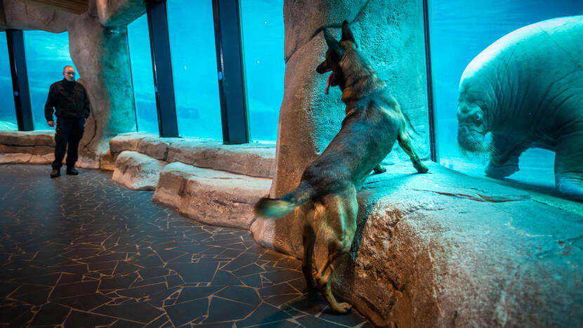 Om zowel hond als geleider ervaring op te laten doen in het speuren op niet alledaagse plekken, is de hondensectie van Vliegbasis Gilze-Rijen altijd op zoek naar uitdagingen. In Harderwijk kunnen beiden volgens oefenleider sergeant-majoor Jan-Willem Jonk hun hart ophalen. Explosievenspeurhonden van Defensie moeten overal ter wereld inzetbaar zijn. Van een stinkende machinefabriek in een ver crisisgebied tot de kletsnatte verblijven van zeekoeien in het Dolfinarium. “We schotelen ze verrassingen voor waar ze zich allebei overheen moeten zetten”, aldus Jonk.
