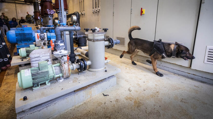 In het Dolfinarium mogen de begeleiders vrijwel overal met de honden werken: in ketelruimtes, nabij de aquaria, de bioscoop, het restaurant, het strand en zelfs in de dierenverblijven. In totaal tuigt de luchtmacht 13 oefeningen op. Misleiding is daarbij de troef. Geurstoffen worden veelal verstopt in attributen die opgaan in de aankleding van het park. Zo wordt een nep-elektriciteitspaal voorzien van een geursample en zit er eentje in een achteloos achtergelaten stapel leidingen. In de bios zit een monstertje in de zitting van een stoel. Jonk: “Een geleider vertelde me dat hij altijd traint met het artikel onder of op de stoel. Voor hem is dit een eye opener.”