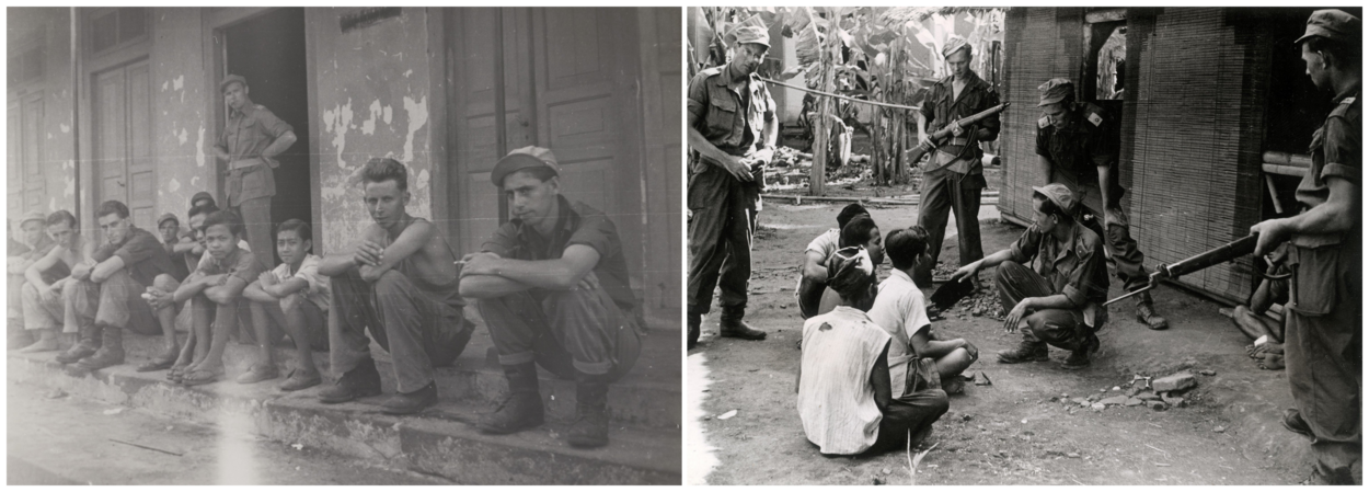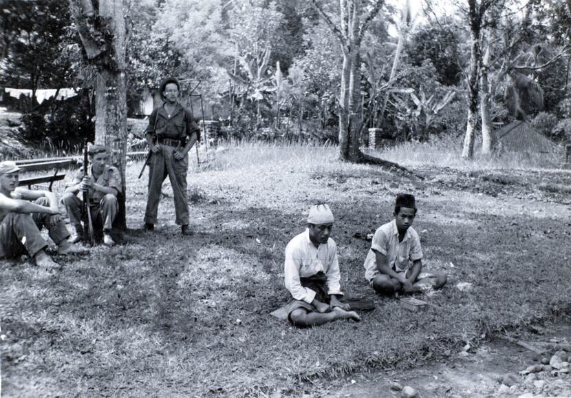 3 Nederlandse militairen (links) bewaken 2 gevangen genomen Indonesiërs tijdens de Eerste Politionele Actie.