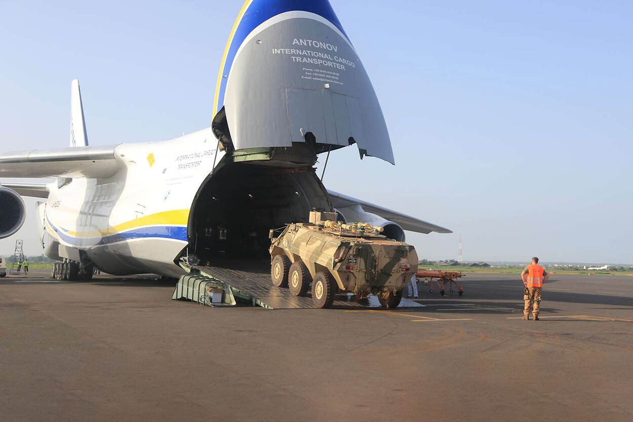 Het vliegveld van Bamako in Mali was voor tal van Nederlandse militairen het beginpunt (en einde) van hun uitzending in het Centraal-Afrikaanse land. Hoewel bijna al onze landgenoten weer thuis zijn gaat de missie gewoon door. Om materiaal op te halen huurde de Bundeswehr een reusachtige Antonov 124-100 in. Foto: Sebastian Nothing Bundeswehr.de.