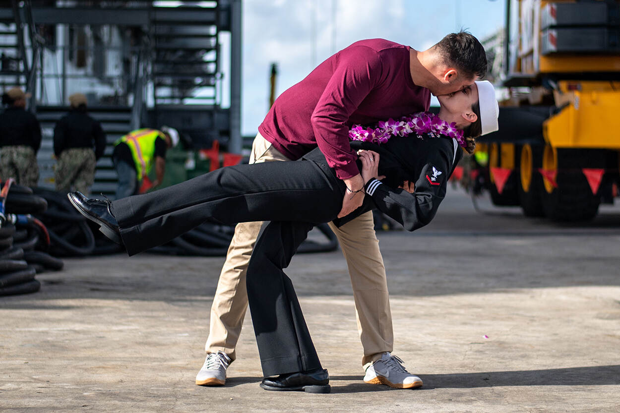 Wat een fijn moment voor matroos Brittney Sharp! Met een hartstochtelijke zoen verwelkomt haar man haar op de kade van de Amerikaanse haven in San Diego Californië. Sharp is kort daarvoor met het schip USS Boxer teruggekeerd na een 7 maanden durende uitzending. Best logisch dat manlief erg blij is. Foto: MCS3 Justin Whitley, U.S. Navy.
