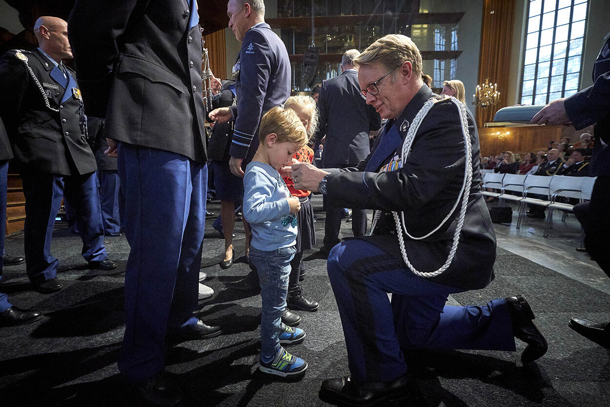 13 marechaussees kregen eind vorige maand de Herinneringsmedaille Internationale Missies opgespeld. Ook de kinderen van de militairen kregen een medaille. Zij hebben hun vader of moeder immers maandenlang moeten missen. Foto: Phil Nijhuis.