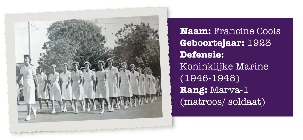 In 1944 treden de eerste vrouwen in dienst bij de Nederlandse krijgsmacht. Ze werken dan als bijvoorbeeld verpleegkundige, typiste of boekhoudster. Eind jaren 70 mogen vrouwelijke militairen ook varen, vliegen en vechten en sinds de jaren 90 voert Defensie een actief beleid om vrouwen te werven en te behouden. In deze nieuwe rubriek komen de dames aan het woord die ervoor gezorgd hebben dat het na 75 jaar heel normaal is dat er vrouwen bij Defensie werken. Francine Cools (96) is de eerste die haar verhaal doet.