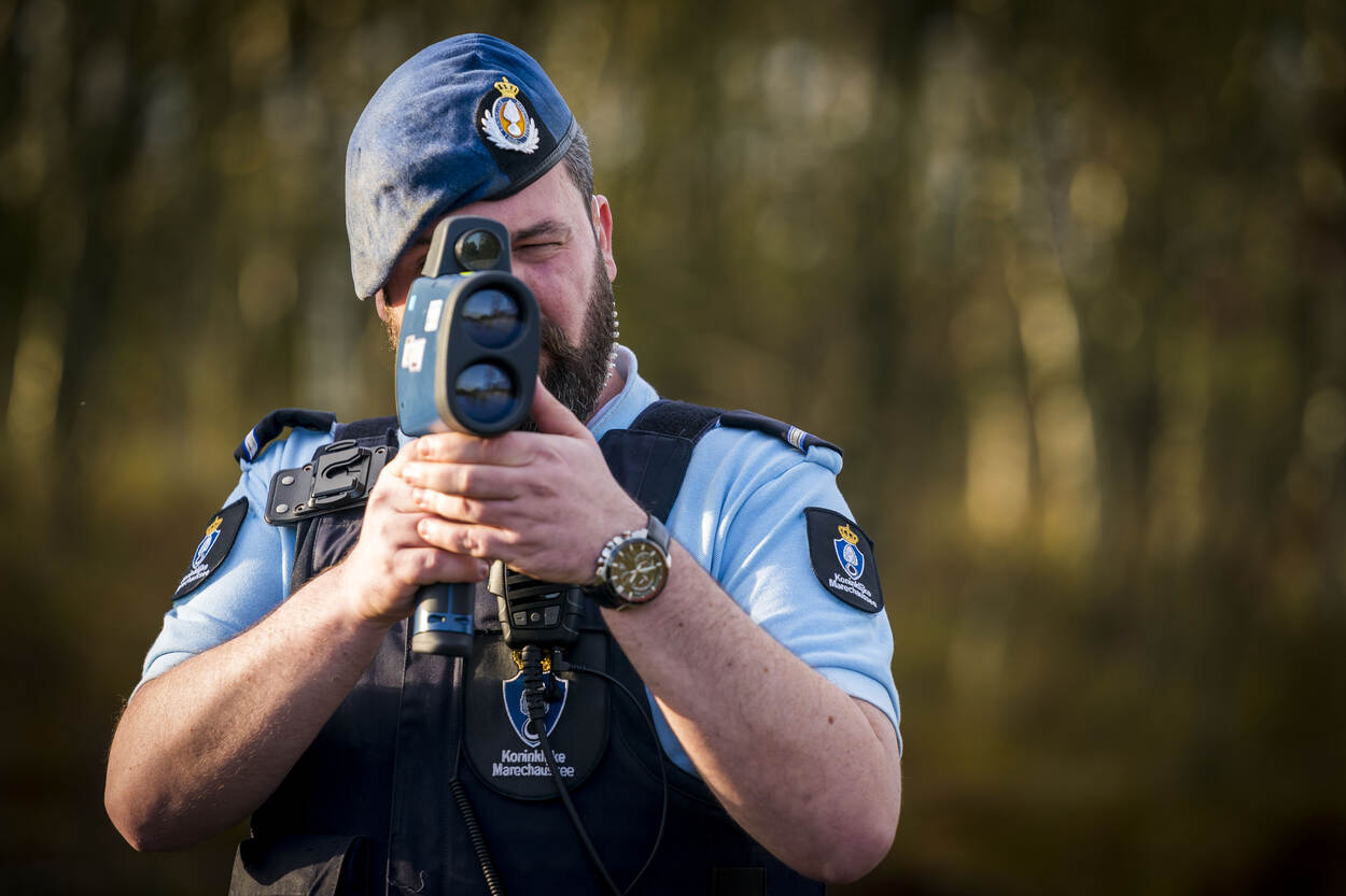 De marechaussee is van vele markten thuis. Meestal is iedereen blij met de inzet van de KMar, maar soms ook niet… Deze marechaussee richt zijn laser op een voorbijrijdend voertuig. Houdt de bestuurder zich aan de snelheid of is hij toch kandidaat voor een bekeuring? Wie zal het zeggen. Fotograaf Valerie Kuypers legde het tafereel vast.