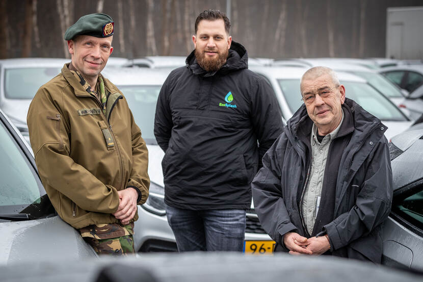 Het driemanschap dat het project Ecologisch Wassen in goede banen leidt. V.l.nr.: majoor Dave Mekking, Melvin Steeman en Martin Zondag.