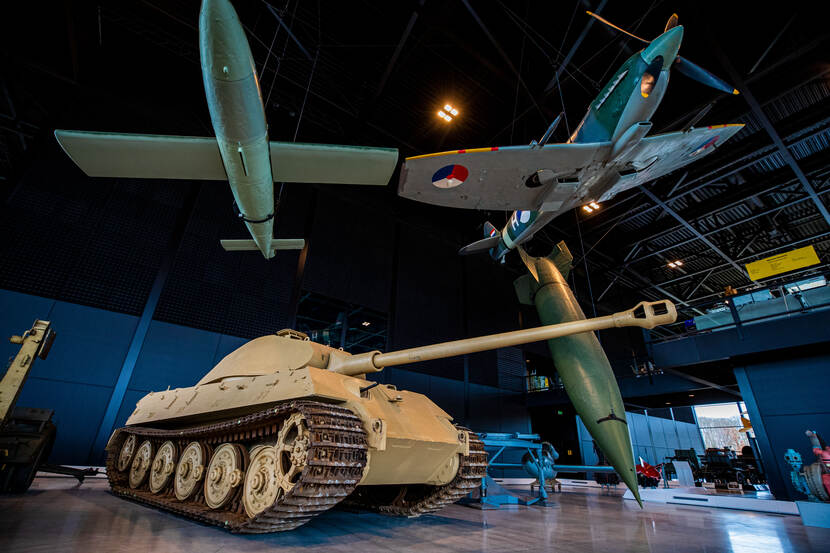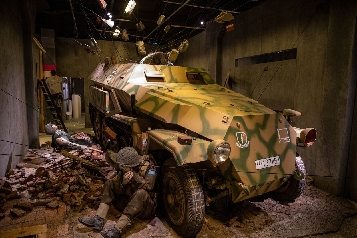 In een lege vitrine staat Duitser Hans. Canadees Léo heeft in de tentoonstellingsruimte al meerdere posities ingenomen. Met nog een week te gaan wordt het bunkerachtige decor van de nieuwe tentoonstelling langzaam gevuld met steeds meer museumobjecten uit eigen collectie en bruiklenen vanuit de hele wereld. Er zitten unieke objecten tussen zoals een Canadees Buffalo rupslandingsvaartuig en een Duitse Tiger II tank, overgekomen uit Engeland.