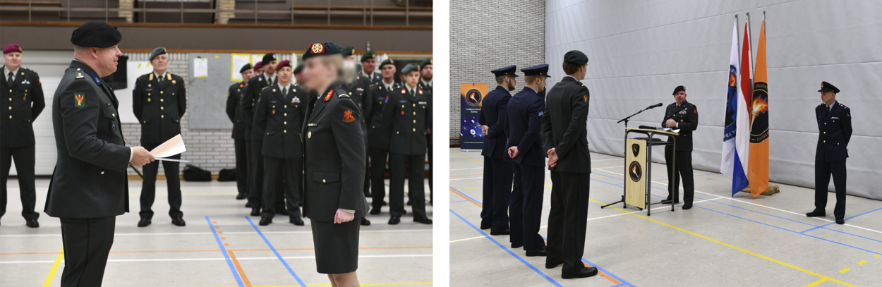 Commandant van het Defensie Inlichtingen- en Veiligheidsinstituut luitenant-kolonel Patrick Dekkers reikt de diploma’s uit onder toeziend oog van commandant Opleidings- en Trainingscommando brigadegeneraal Frits van Dooren.