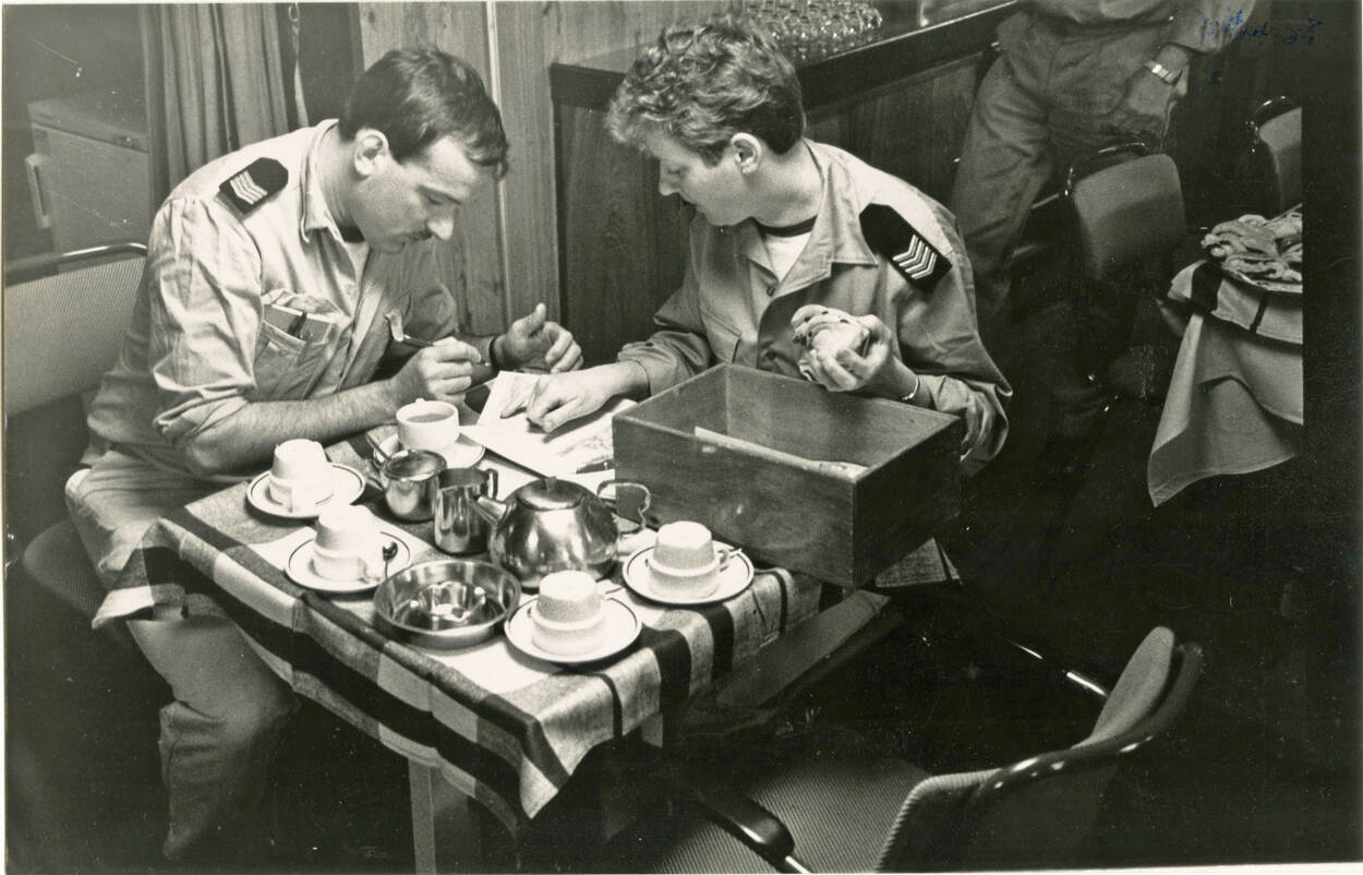 In totaal werkte Elly 4 jaar op de Zuiderkruis, waarvan de 2e varende periode als sergeant-majoor. In die hoedanigheid was ze de enige vrouw in de mess voor onderofficieren, wat voor haar geen probleem was. “Je moet gewoon zelf niet te moeilijk doen. Van beide kanten is het geven en nemen. Als ze een bepaalde film wilden zien, dan ging ik gewoon ergens anders zitten. Van mijn kant nam ik mijn handwerkje mee naar de mess. Dat gaf ook een stuk gezelligheid. De wasplaatsen deelden we, want je kunt niet voor één vrouw de boel afsluiten. Ik waarschuwde wel als ik binnen kwam. In die tijd was de marineleiding wel heel voorzichtig. Er was allerlei regelgeving, bijvoorbeeld dat je niet met elkaar mocht dansen. Ook was er extra verlichting aangebracht. Ze hielden met alle scenario’s rekening. Nu lach je erom. Al met al was het een tijd die ik zo weer zou overdoen.”