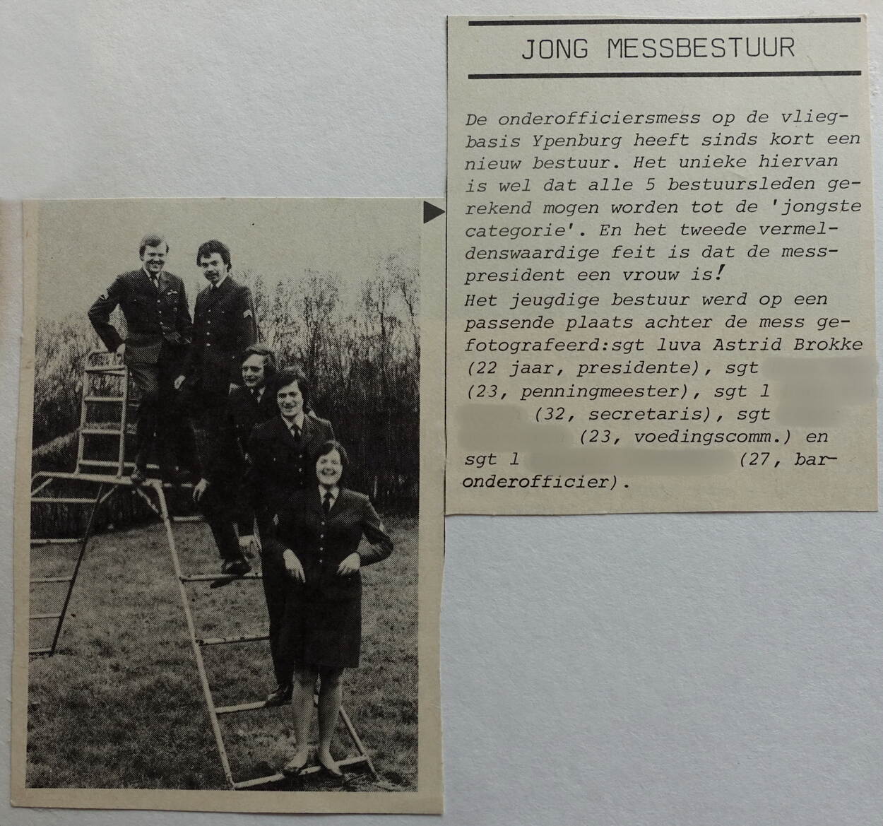 Het is een nevenfunctie die veel tijd kost en meestal door een oudere onderofficier wordt uitgevoerd: als messpresident leiding geven aan de bar, feestzaal en keuken van een vliegbasis. Toen deze functie vacant was op vliegbasis Ypenburg dacht Astrid, toen 22 jaar oud, ‘dat lijkt mij wel wat’. Tot haar eigen verbazing werd ze met 80% van de stemmen gekozen.