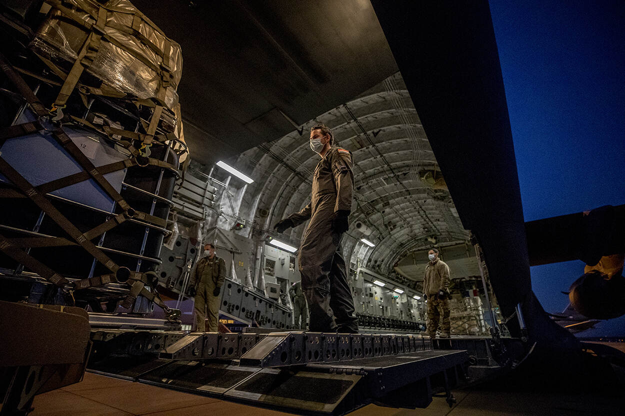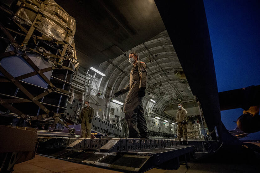 Op vliegbasis Eindhoven werd een C-17 transportvliegtuig beladen met medische apparatuur en hulpgoederen voor het Caribisch gebied. Foto: sergeant-majoor Maartje Roos