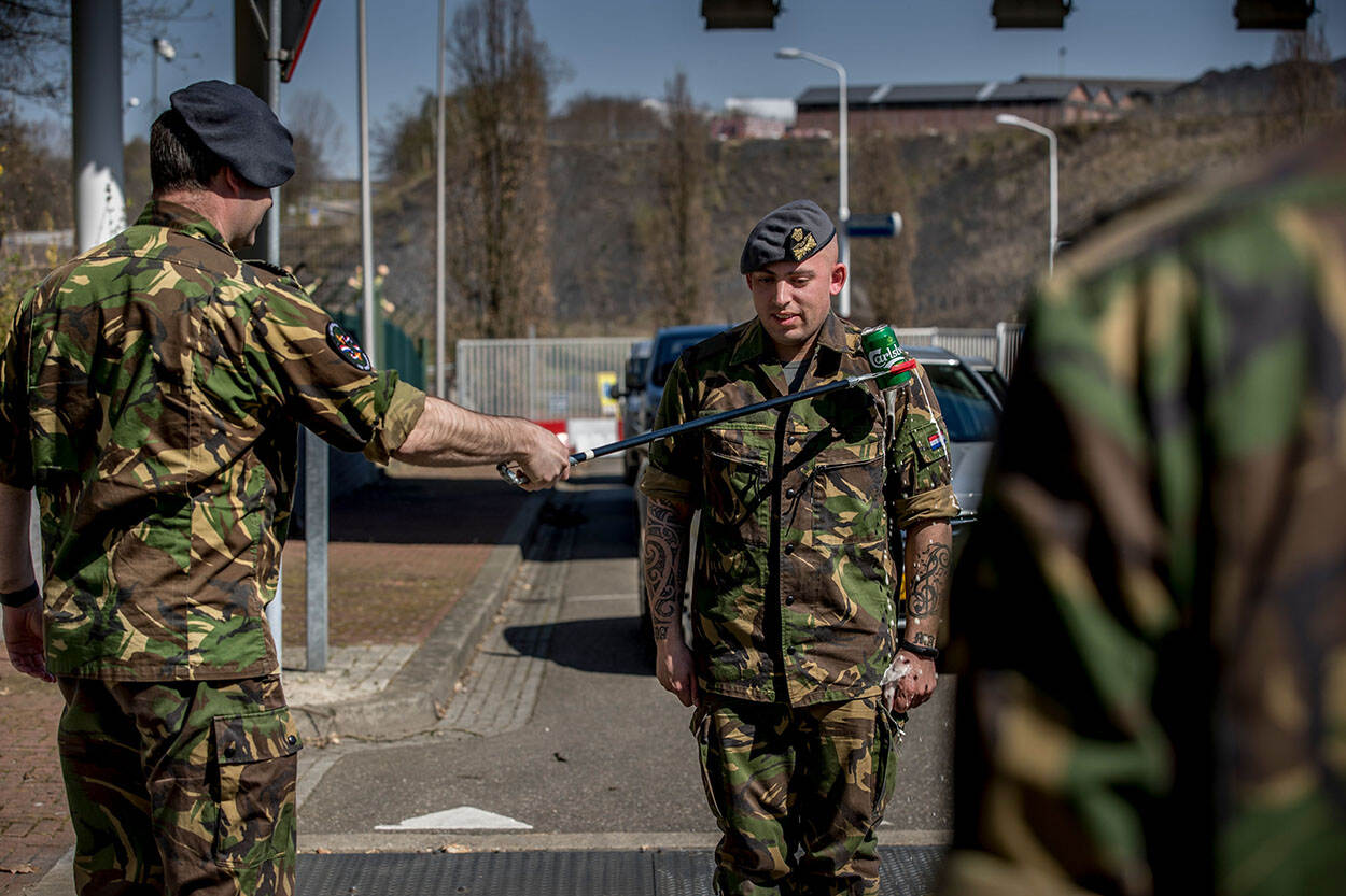 Rest alleen nog de traditie van de strepen nat maken met bier. En ook hier geldt: met de juiste afstand. Foto: sergeant-majoor Maartje Roos