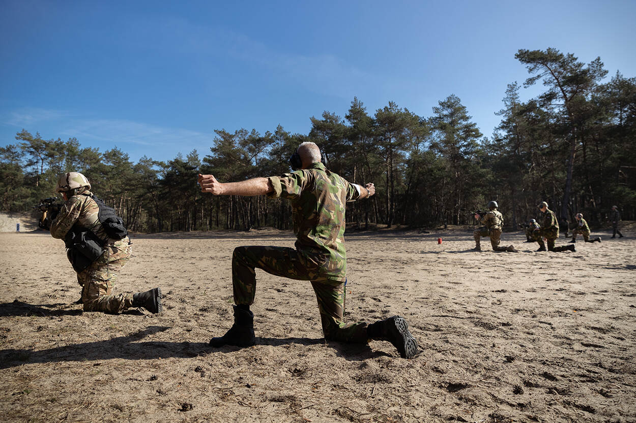 Naast het regelmatig ontsmetten van de handen, houdt iedereen tijdens de BULA zo goed mogelijk afstand. Hier legt een instructeur uit hoe het terugtrekken onder vuur in zijn werk gaat. Foto: sergeant Aaron Zwaal