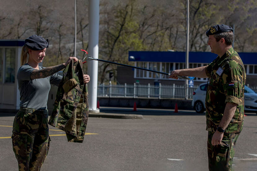 Waar normaal de oude rangonderscheidingstekens van het jasje worden gehaald om vervolgens de nieuwe er weer op te schuiven, gaat dat in tijden van de coronacrisis net even anders. De nieuwe strepen zitten nu al op het jasje, en dit wordt met inachtneming van de juiste afstand overgedragen aan de collega die wordt bevorderd. Innovatief! Foto: sergeant-majoor Maartje Roos