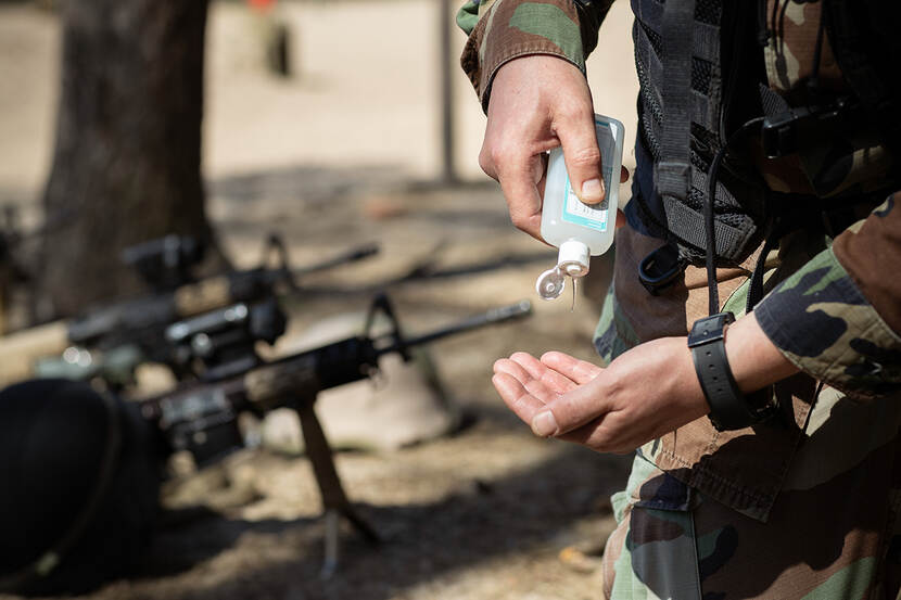 Handen wassen, handen wassen! De Buitenlandopleiding (BULA) van de Koninklijke Marechaussee gaat gewoon door. Deze opleiding is voor militairen die individueel worden ingezet in het buitenland. Omdat hun inzet ook doorgaat, stopt de opleiding niet. Foto: sergeant Aaron Zwaal