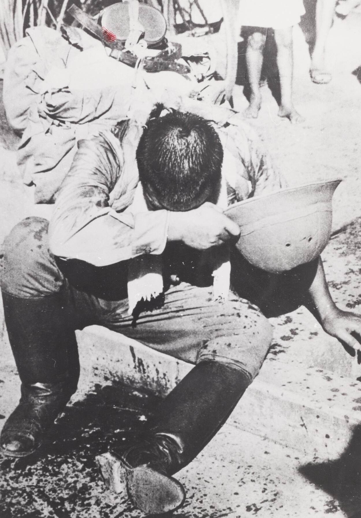 Een Japanse officier buigt het hoofd uit schaamte en verslagenheid.