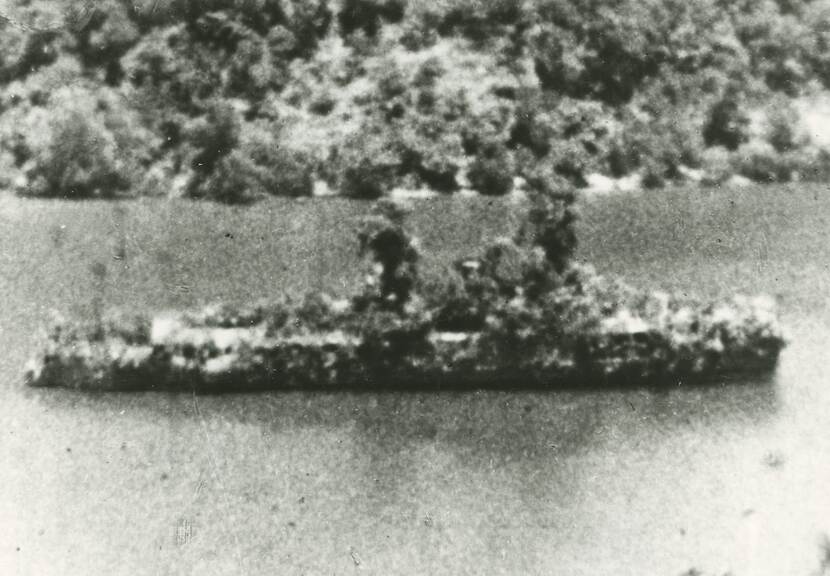Hr.Ms. Abraham Crijnssen bedacht een vernuftige list om de oversteek naar Australië veilig te maken. Geschilderd in camouflagekleuren en bedekt met netten, takken en ander groen, vermomde het schip zich als tropisch eiland.