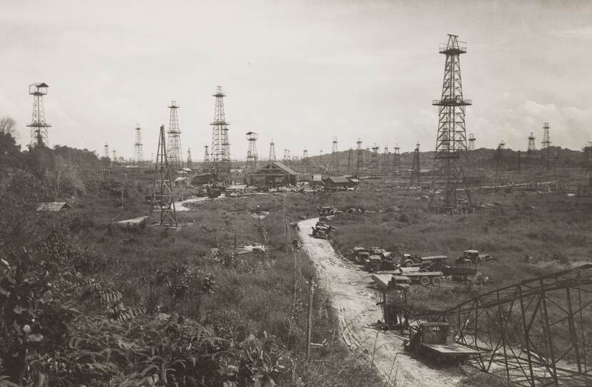 De verwoestingen op het eiland Tarakan nadat in totaal 100.000 ton olie in brand werd gestoken.