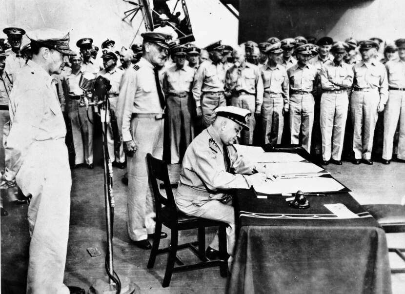 Aan boord van het Amerikaanse oorlogsschip USS Missouri in de baai van Tokio tekent Japan de overgave officieel.