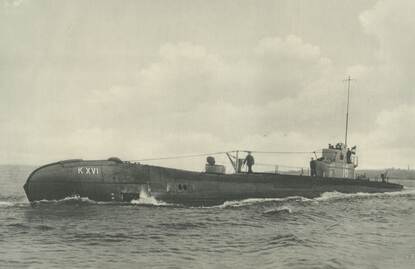 Archieffoto van de onderzeeboot K XVI. 1 dag na de succesvolle aanval op de Sagiri, werd de Nederlandse onderzeeër tot zinken gebracht door een Japanse onderzeeboot. Alle 36 opvarenden kwamen daarbij om het leven.