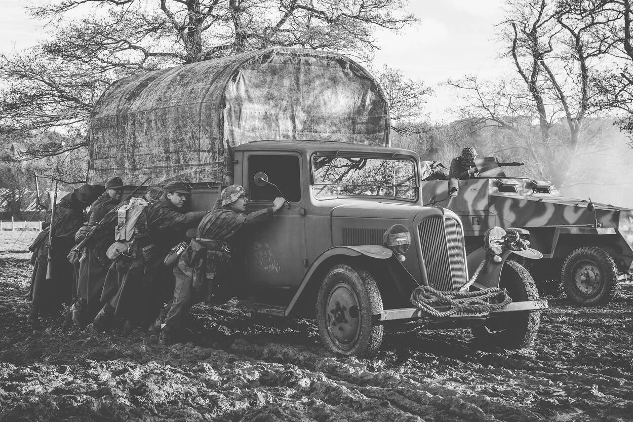 "Als je de geschiedenis naspeelt, moeten de details kloppen. Denk aan voertuigen en wapens, maar ook petroleumstelletjes en verbanddozen. Soms is het zo angstaanjagend realistisch dat er bordjes bijgezet moeten worden waarop bijvoorbeeld staat dat de acteurs niet de ideologie van het toenmalige nationaalsocialistisch Duitse regime delen.”