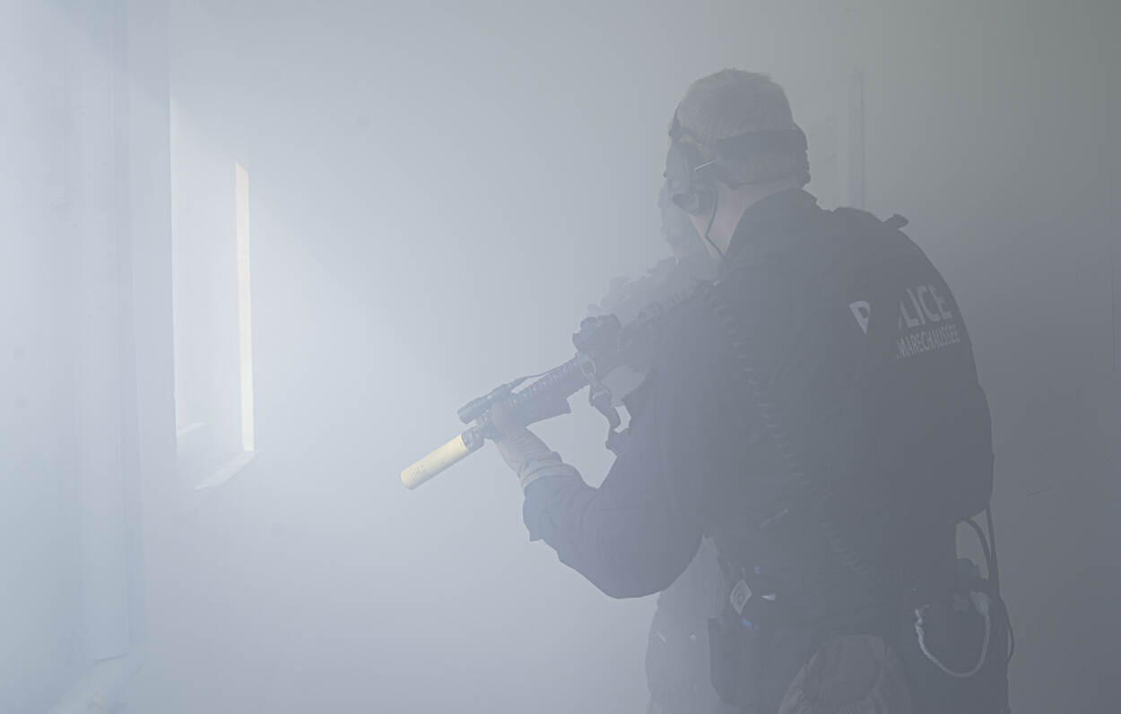 Een rookmachine zorgt op camera voor een bijzonder special effect. De foto werd genomen bij een training van de Brigade Speciale Beveiligingsopdrachten op oefenterrein Weeze. Specifiek de VIP-beveiliging werd beoefend. Foto: sergeant Cynthia Nijssen