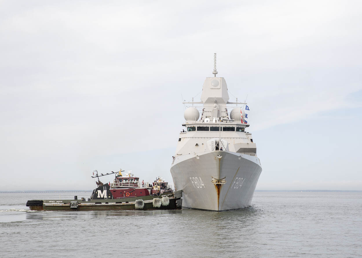 In LENS! mag de Koninklijke Marine zeker niet ontbreken. We zien hier het fregat Zr. Ms. De Ruyter in de haven van Norfolk, Virginia. Het schip heeft opdracht gekregen naar zee te gaan in verband met orkaan Dorian en krijgt van deze Amerikaanse sleepboot een duwtje in de goede richting. Of is het toch een verkapt afscheidskusje? Foto: MC2 Stacy Atkins Ricks.
