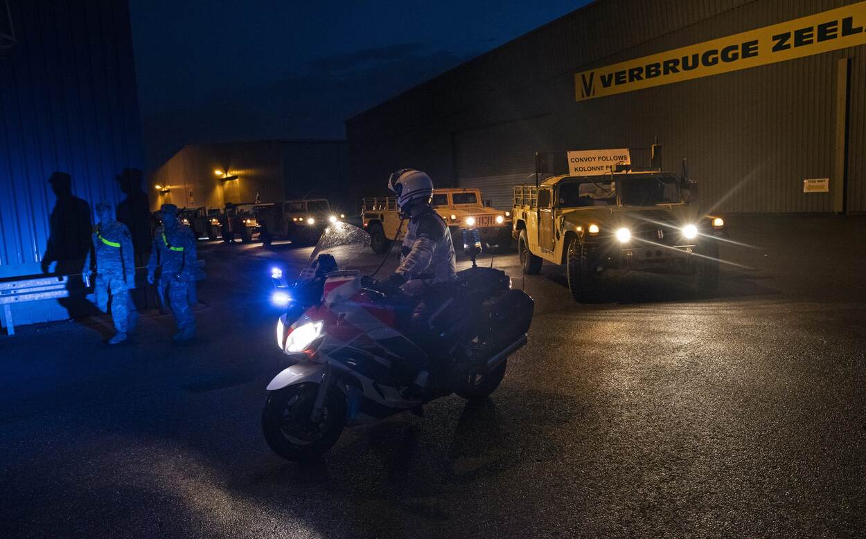 Een konvooi Amerikaanse legervoertuigen staat gereed om de weg op te gaan en ook de marechaussee die de Amerikanen tot de Duitse grens begeleidt, is er klaar voor. Zijn zwaailichten staan al aan! De locatie is de haven van Vlissingen, de datum 14 oktober 2019. Foto: Sergeant Kyle Larsen.