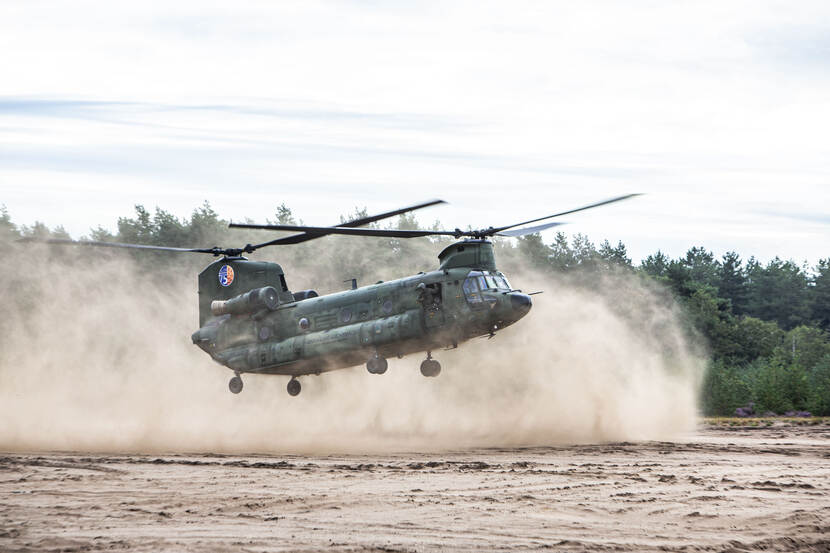 Dag 4 van oefening HOT NL deed het nodige stof opwaaien. Helikopters van de Koninklijke Luchtmacht en grondeenheden van 11 Luchtmobiele Brigade oefenen tussen 17 augustus en 4 september op verschillende Nederlandse locaties op ‘brown out’ landingen. Ofwel landingen waarbij een grote zandwolk ontstaat. De training vindt normaal gesproken plaats in Zuid-Europa, maar vanwege corona kan dat nu niet. Foto: sergeant Cinthia Nijssen.